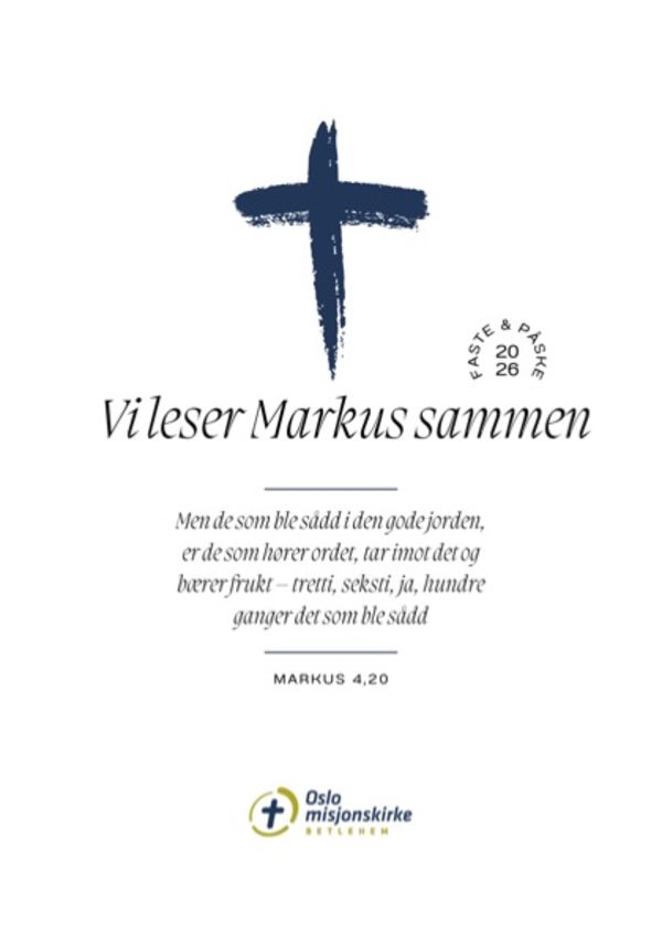 I år ønsker vi å bruke fastetiden og påska på å bli bedre kjent med Jesus gjennom Markusevangeliet. Vi har derfor laget et hefte med bibelleseplan med refleksjonsspørsmål og forslag til bønn. På gudstjenestene får vi også høre taler med utgangspunkt i Markus. Heftet med leseplan vil bli delt ut på gudstjenestene, og er også tilgjengelig digitalt. Leseplan i PDF